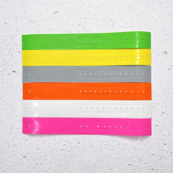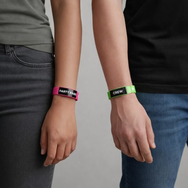 اساور يد بلاستيك للفعاليات قابلة للطباعة بالكامل حسب تصميمك. أضف شعارك أو النص الذي تختاره لتحصل على سوار عملي وأنيق، قابل للاستخدام المتكرر ويعكس هويتك بشكل واضح ومرتب